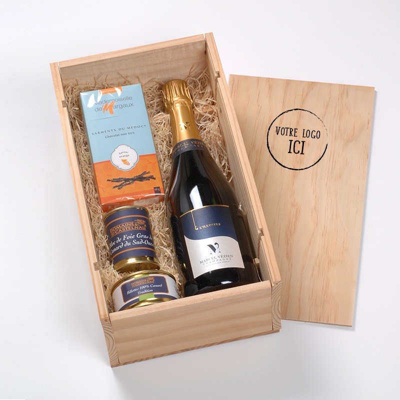 Ce coffret avec 1 bouteille de « Champagne L Illustre Marcel Vezien » en caissette de bois avec de la frisure/calage rouge – ou autre au choix – contient :